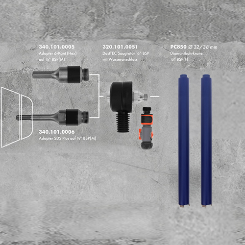 • Komplett-System in Ø 32 oder Ø 38 mm Diamantbohrkrone