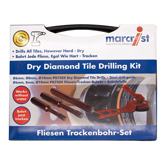 Komplett-Set mit Anbohrhilfe + PG750X HEX Bohrer Ø 6mm, Ø 8mm, Ø 10mm. Bohrt härteste Fliesen mit Leichtigkeit. Ideale Drehzahl: > 2500 U/min. Jeder Bohrer hält bis zu 60-100 Bohrungen in Feinsteinzeug Härte 5
